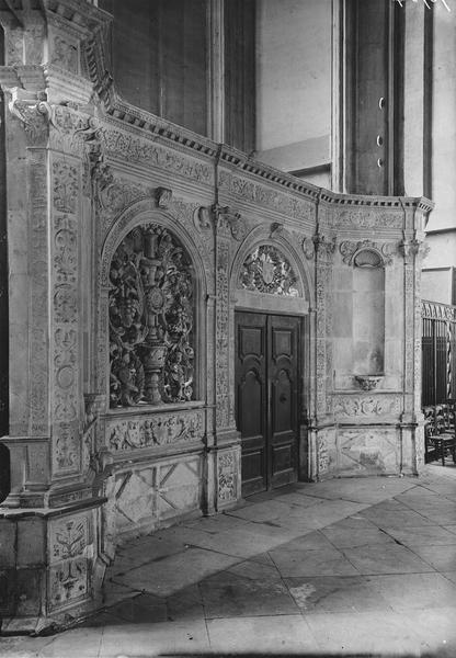 Clôture de la chapelle du Saint-Sépulcre percée de cinq baies, dont celle du centre, deux fois plus grande que les autres et qui sert de porte, vantaux qui portent de chaque côté des statues. Clôture de choeur, restée inachevée et installée dans une des chapelle du choeur.