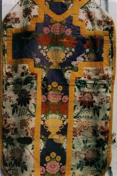 Soierie à fond blanc avec grosses fleurs rouges et crème, et feuillages verts ; applique en forme de croix d'une soierie à fonds violet et bouquets dans un vase ; galon jaune doré.