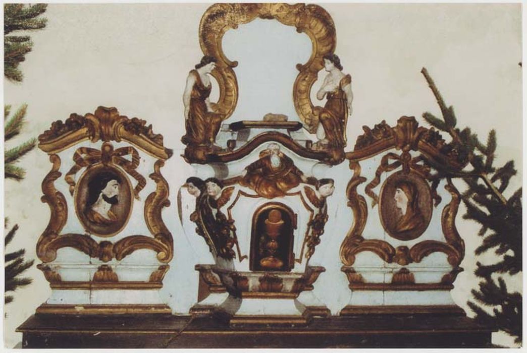 Sur la porte est sculpté un calice surmonté d'une hostie. Au-dessus, Dieu le Père en buste émerge de nuées. Les ailes du tabernacle sont ornées de médaillons ovales présentant les têtes de la Vierge et de saint Joseph de profil. Au-dessus du tabernacle, l'exposition est encadrée de deux anges adorateurs agenouillés.