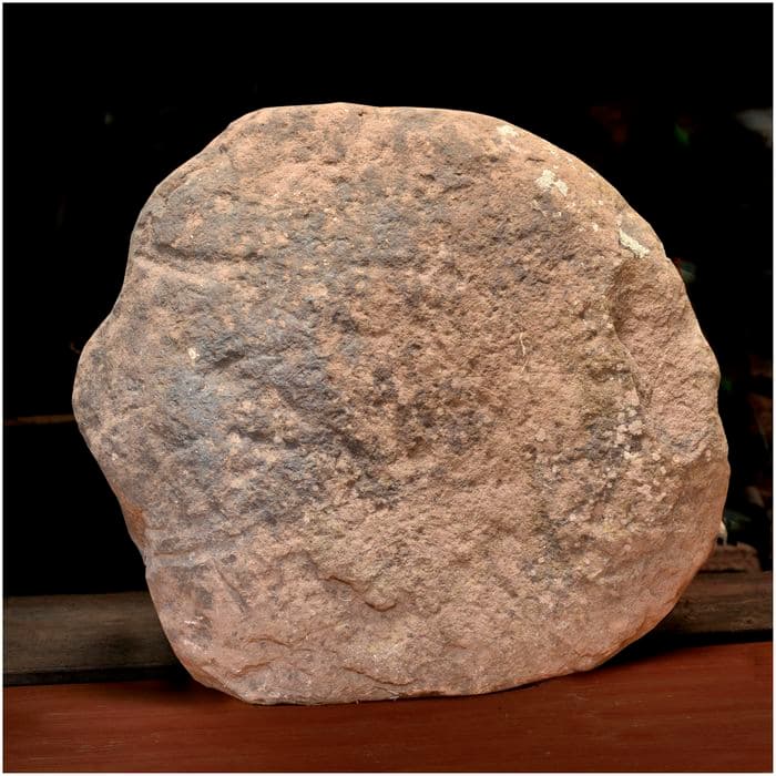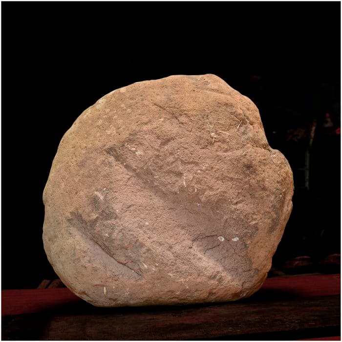 Statue-menhir masculine finement gravée amputée de la partie sommitale et de la partie basale gauche. Le personnage présente des bras obliques prolongés par des mains aux doigts individualisés, 2 jambes jointives avec un bel arrondi des genoux et des pieds. Il porte une ceinture à chevrons et est équipé d'un fourreau à anneau et d'un baudrier uniquement visible dans le dos, entre les 2 omoplates.