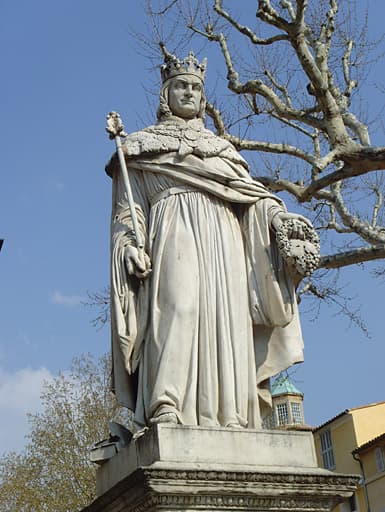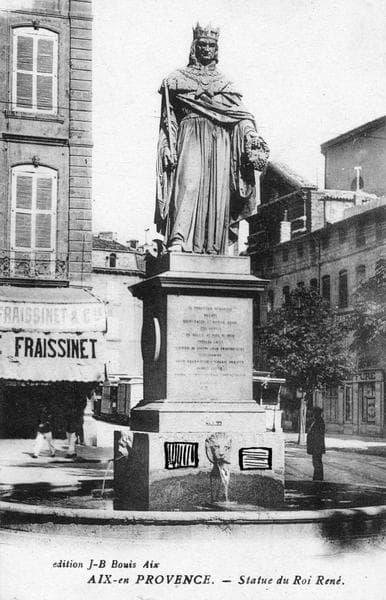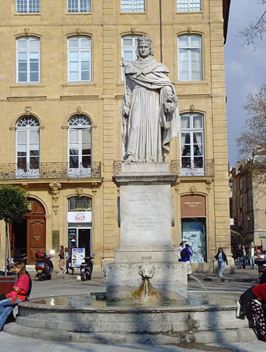 Le roi tient dans la main droite le sceptre du pouvoir et dans la gauche le raisin muscat qu'il introduisit en Provence. Sur les deux côtés du socle, se trouvent les médaillons de ses ministres Matheron de Salignac et Palomède de Forbin.