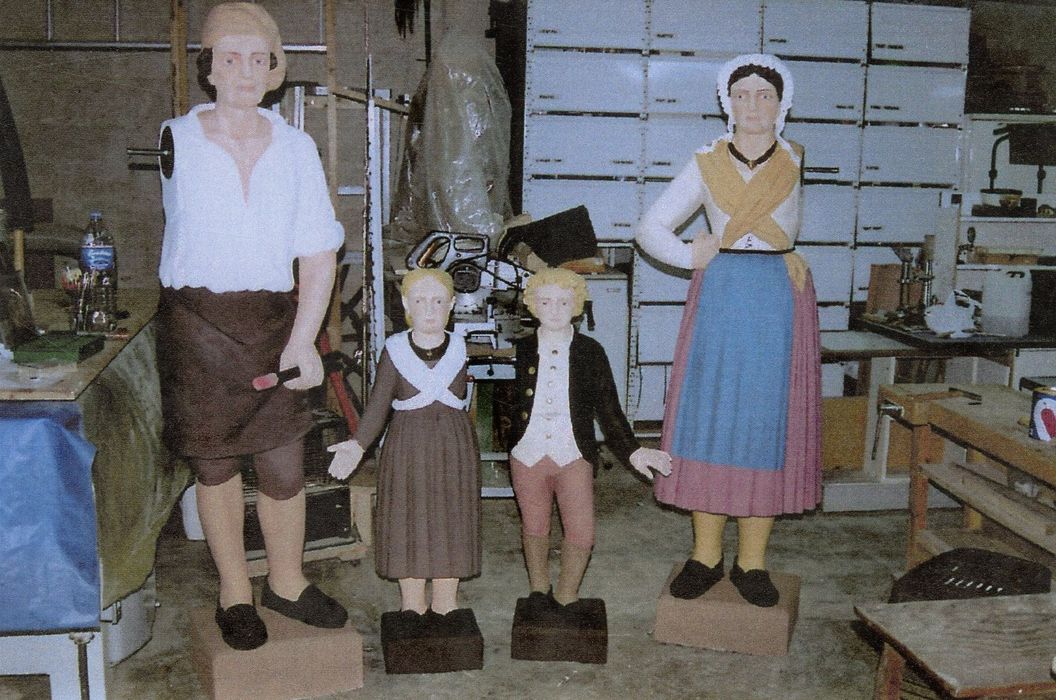Comprenant quatre personnages : le père, la mère et les enfants en bois sculpté recouverts de fer battu peint.