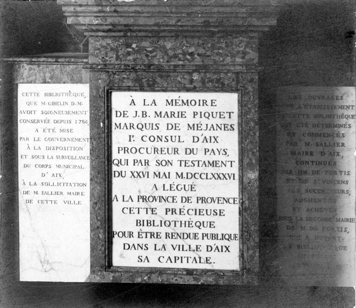 Porte l'inscription : A la mémoire de J.B. Marie Piquet marquis de Méjanes 1er consul d'Aix procureur du pays qui par son testament du XXVI mai MDCCLXXXVI a légué à la province de Provence cette précieuse bibliothèque pour être rendue publique dans la ville d'Aix à sa capitale.