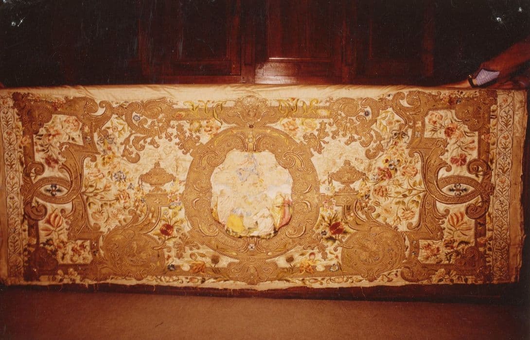 Broderie polychrome et application de fils d'or. Le motif central représente l'Assomption de la Vierge, emportée dans les nuages, sous les yeux des Apôtres.