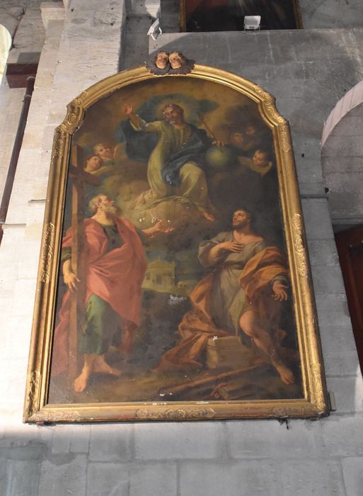 Christ sur un nuage entouré de têtes d'angelots, apparaissant à deux saints situés au niveau terrestre : saint Pierre et saint Jacques le Juste (selon Paulet), saint Jacques le Mineur et saint Philippe (selon l'inspecteur Mottin).