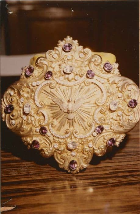 Au centre du fermail est sculptée la colombe du Saint-Esprit d'où partent des rayons.