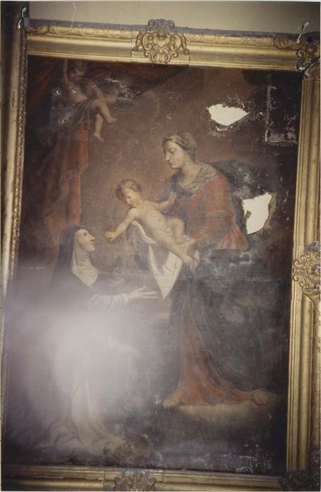 La Vierge, à droite, présente l'Enfant à la sainte agenouillée à gauche. Au-dessus de la sainte, draperie rouge avec deux anges.