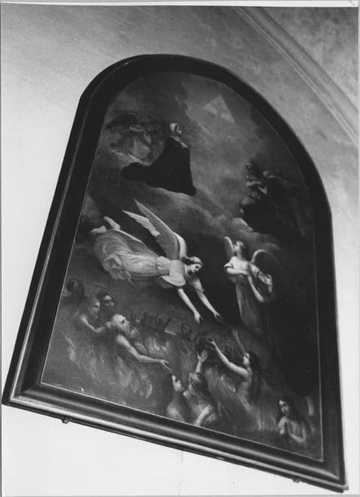 Au sommet de la composition, se trouve une croix devant laquelle est agenouillée la Vierge à qui les anges tirent les âmes.