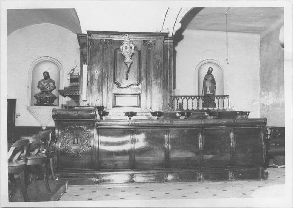 La sculpture ornant les stalles représente les armes pontificales au milieu de deux branches de feuillage.