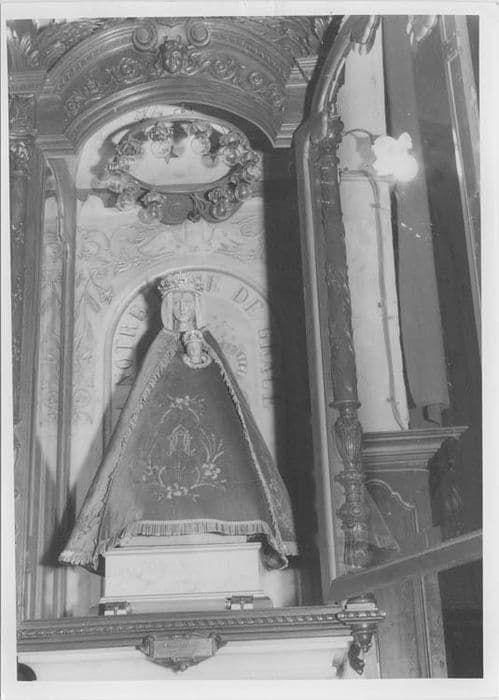 La statue est en noyer. Elle est habillée à l'espagnole. Dépouillée de ses ornements, elle apparaît assise. Il s'agit d'une statue d'applique qui a été consolidée en 1925 par une plaque d'argent placée au dos et une ceinture d'argent autour de la taille.