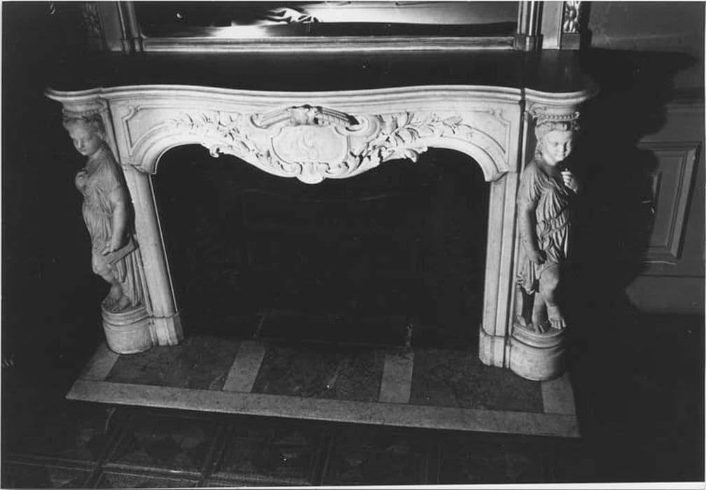 La cheminée est ornée de deux enfants-cariatides dont l'un tient un rameau d'olivier et l'autre un rouleau de papier ainsi que d'un médaillon avec les initiales de Charles Gounelle, premier propriétaire de la villa.