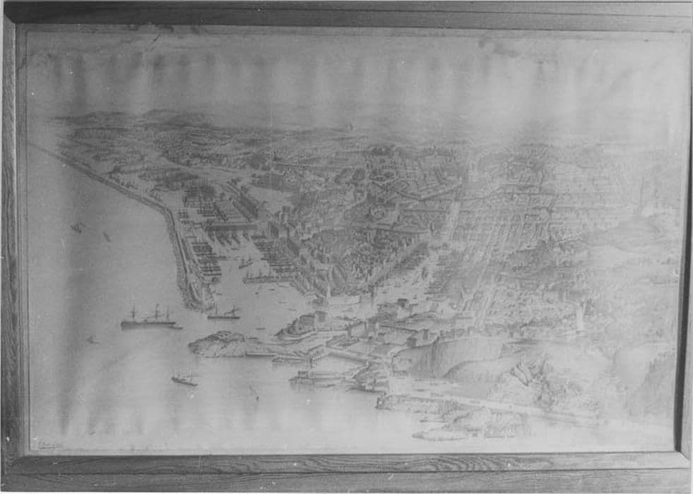 Vue du port et de la ville de Marseille en perspective cavalière.