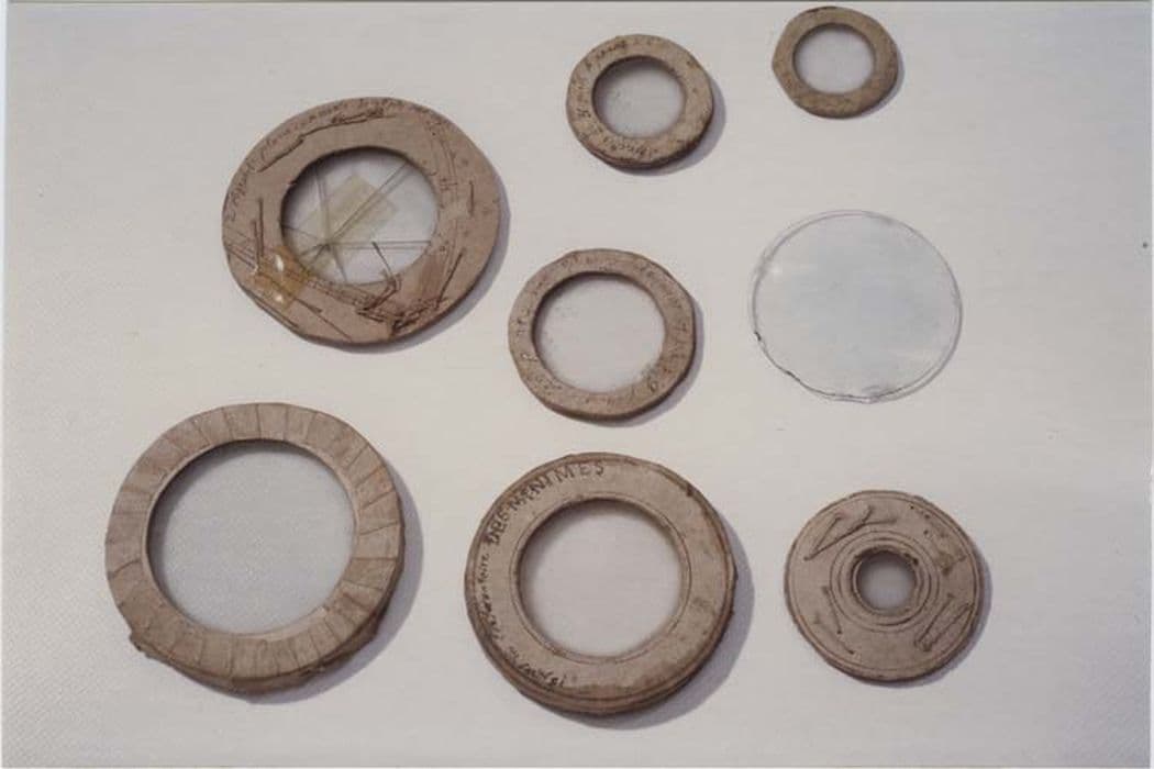 Les lentilles sont en verre. Sept d'entre elles sont serties dans des étuis en carton cousu avec les tailles des focales inscrites à l'encre.
