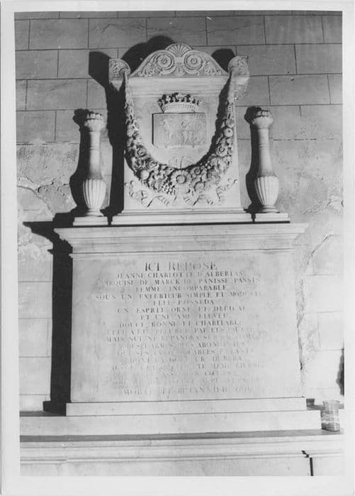 Tombeau avec épitaphe gravée rappelant les mérites de Jeanne Charlotte d'Albertas marquise de Marck de Pannisse-Passis morte en 1816.
