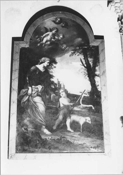 Sainte Elisabeth guide Jean-Baptiste qui porte la croix de sa main gauche et désigne l'agneau de l'autre main.