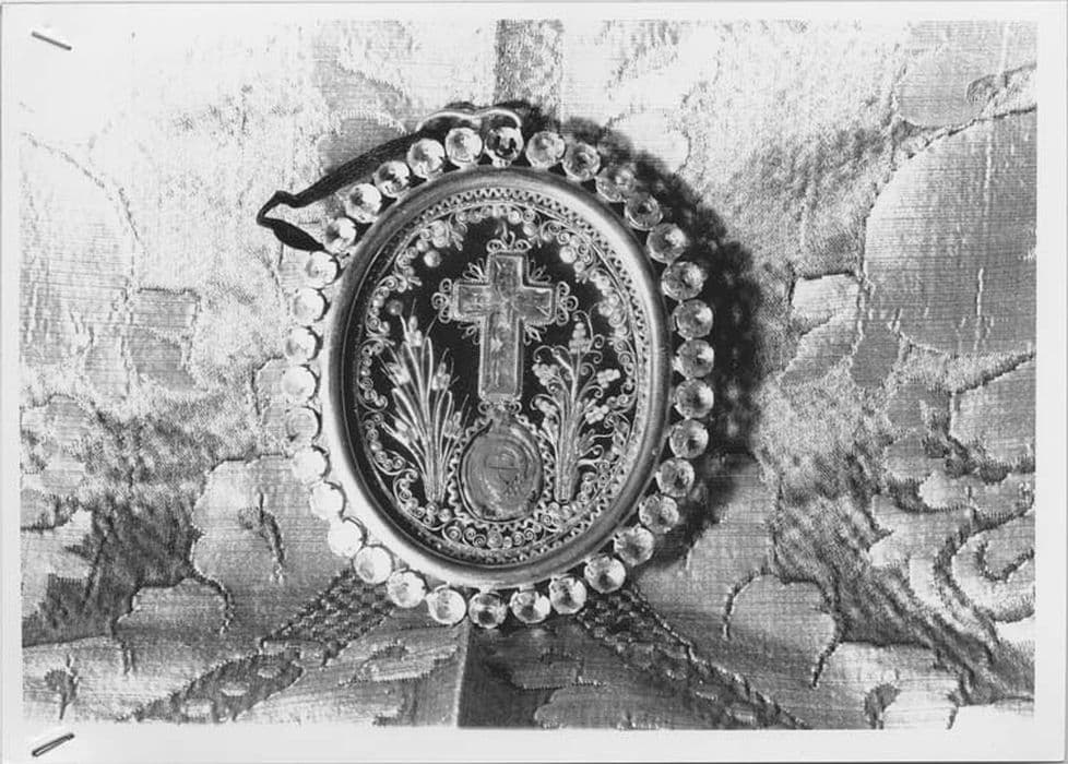 perle ; cuivre : doré ; pierre précieuse ; papier : doré ; cire