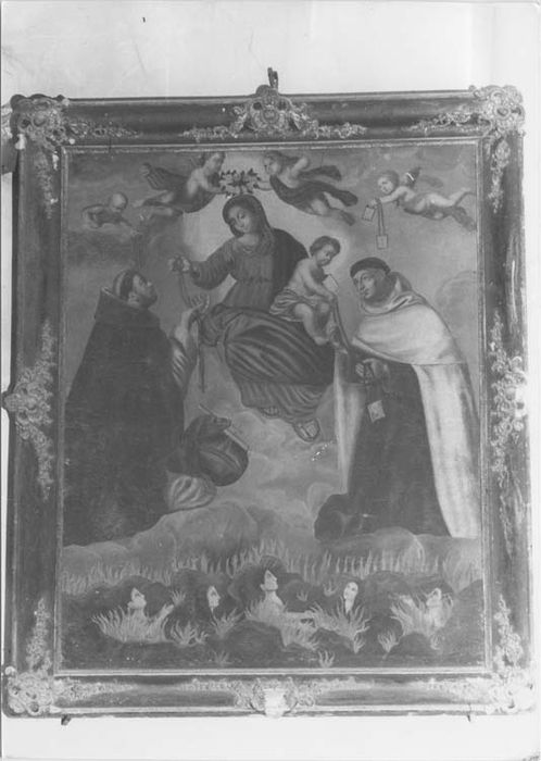 La Vierge à l'Enfant couronnée par les anges tend le chapelet à saint Dominique, flanqué d'un chien, tandis que l'Enfant Jésus tend le scapulaire à saint Simon Stock, patron des Carmes, afin de le protéger des flammes de l'enfer.
