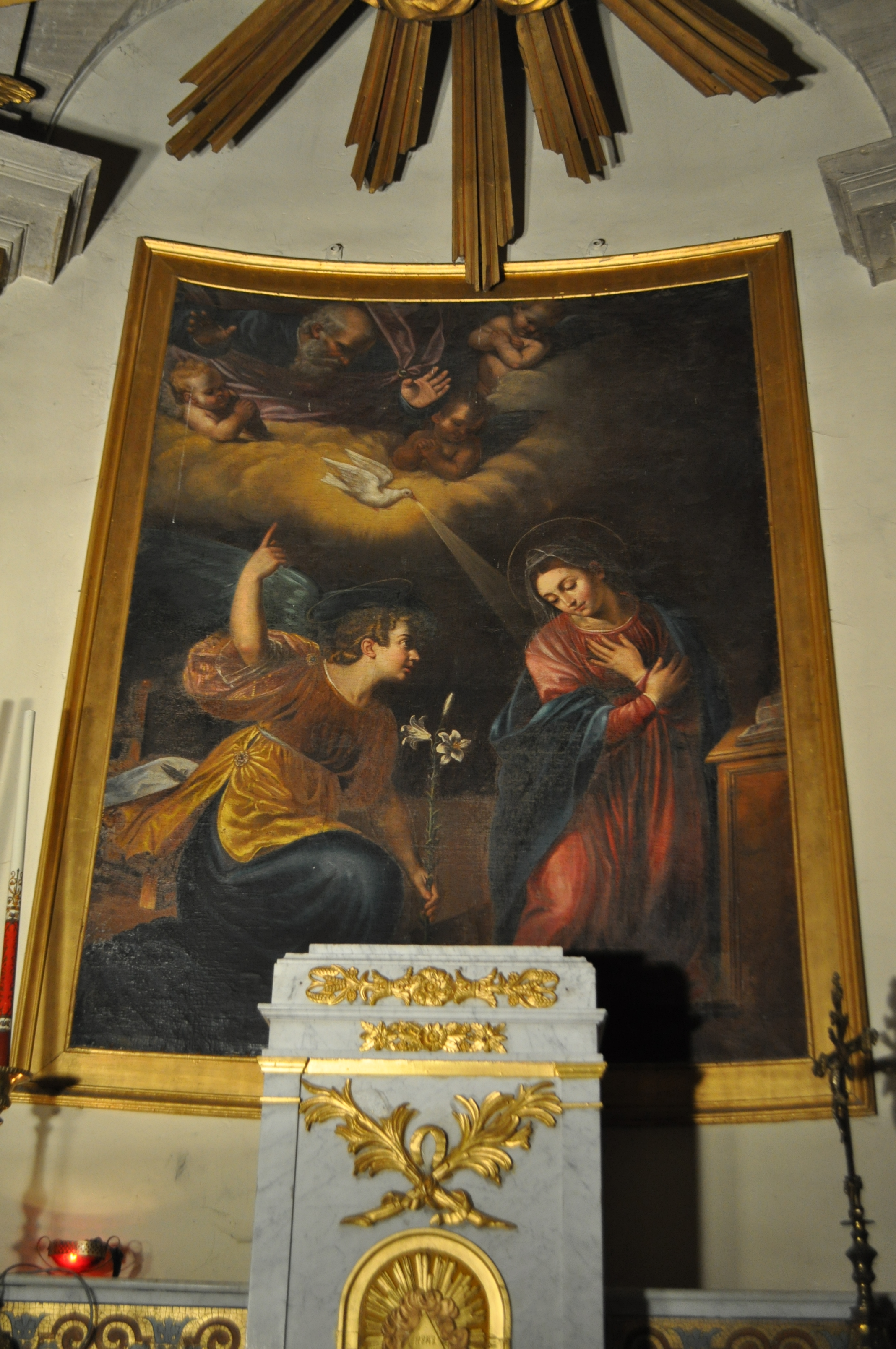 La Vierge, les mains sur la poitrine, reçoit la visite de l'ange qui pointe l'index vers le ciel ; dans la brèche ouverte dans le ciel, Dieu le Père envoie le Saint-Esprit darder ses rayons sur le sein de la Vierge.