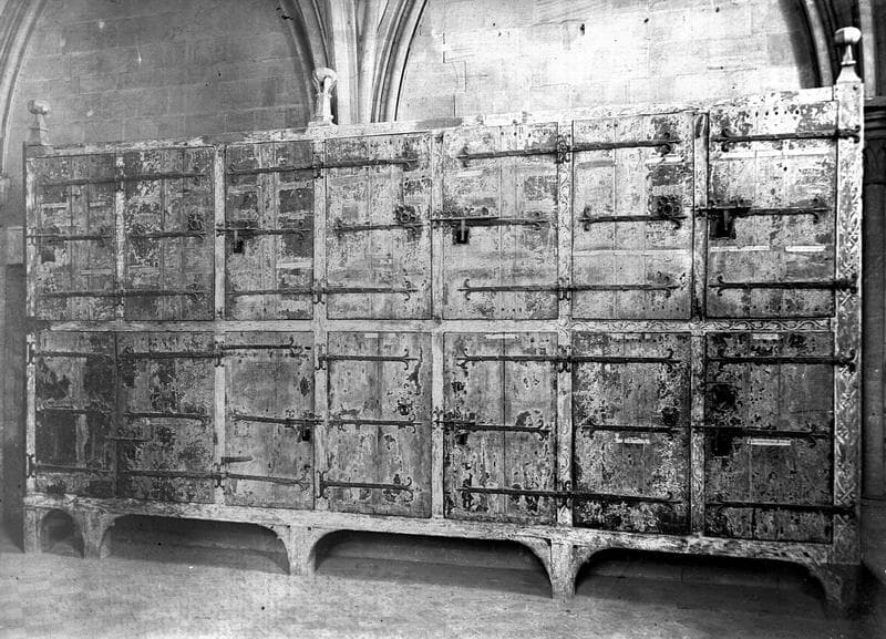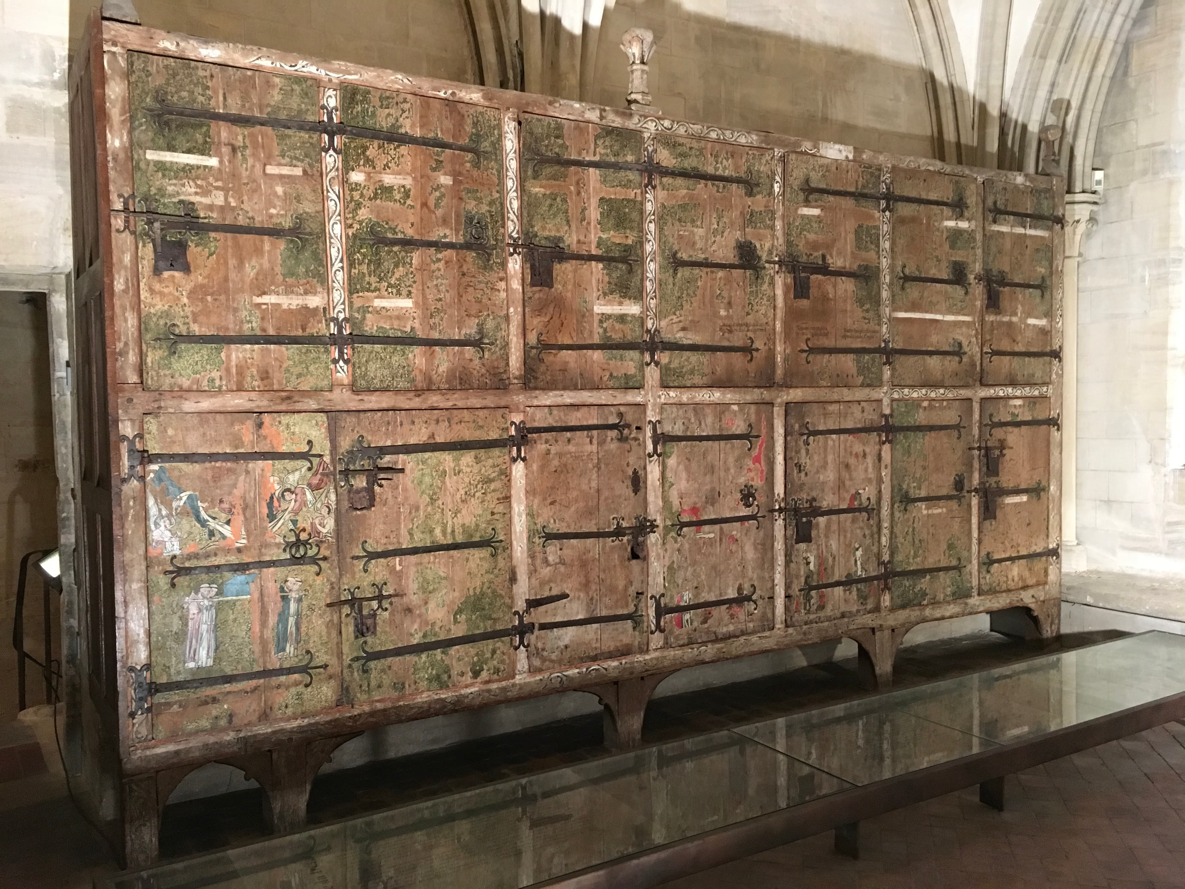 Armoire décorée de peintures ; assemblage de panneaux à grain d'orge et faux tourillons ; battant avec le bâti : feuillure sur le bâti ; pentures et serrures à vertevelle