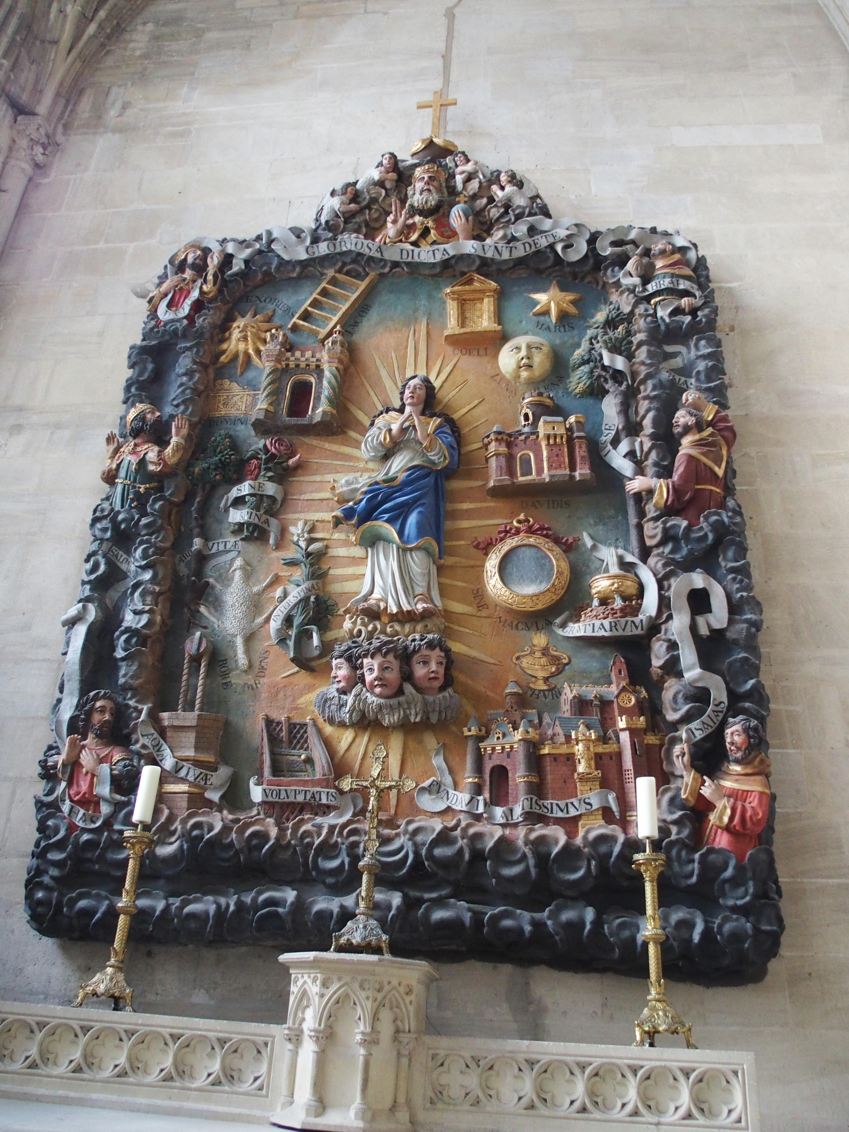 Bas-relief qui provient sans doute d'un retable des litanies de la Vierge ; cadre composé de nuages où apparaissent Dieu le Père et les prophètes.