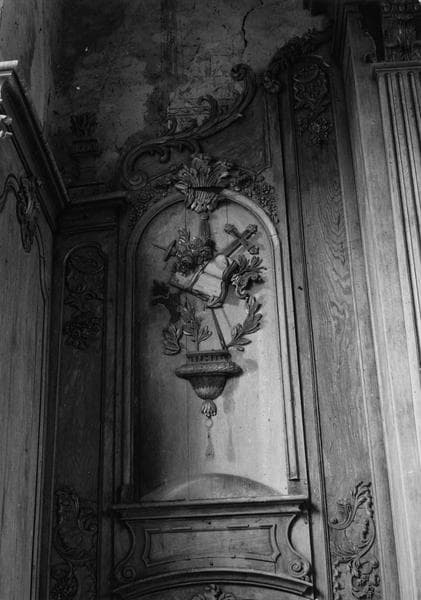 retable : enroulement de vignes sur la face verticale et fleurs à quatre pétales sur la douelle