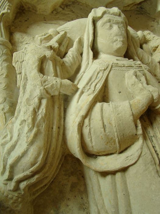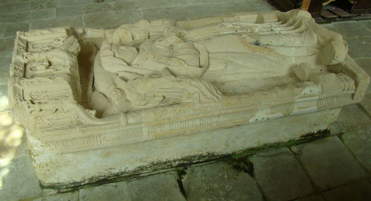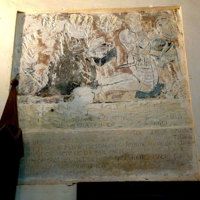Dalle à effigie en relief de Jehanne d'Argouges femme de Robert Hamon, seigneur de Campigny ; pierre de Marie Descaque, dame d'honneur de Catherine de Médicis