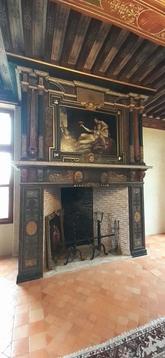 Avec sa toile peinte et panneaux qui lambrissent la salle ; motifs végétaux en faible relief sur les piédroits ; sur la hotte, colonnettes grêles, décrochements, peintures, stucs et chérubins.
