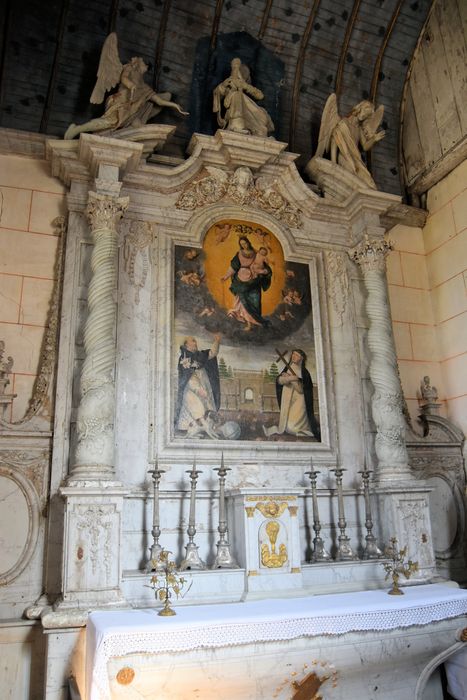 Deux colonnes torses cannelées et décorées de pampres au tiers inférieur supportent une corniche à ressauts, flanquée de départs de fronton ; au sommet, Vierge à l'Enfant entre deux anges.