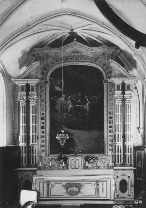 Retable du maître-autel ; au centre, cadre en anse de panier ; le pourtour du cadre simule un appareil à refends garni de plaques de marbre polychromes ; colonnes corinthiennes octogonales jumelées ornées de petits rectangles de marbre noir ; chaque paire repose sur un piédestal unique avec médaillon ovale en marbre noir ; au sommet, départs de fronton en forme de doucine, au centre, légèrement plus haut, corniche à ressauts dessinant trois angles
