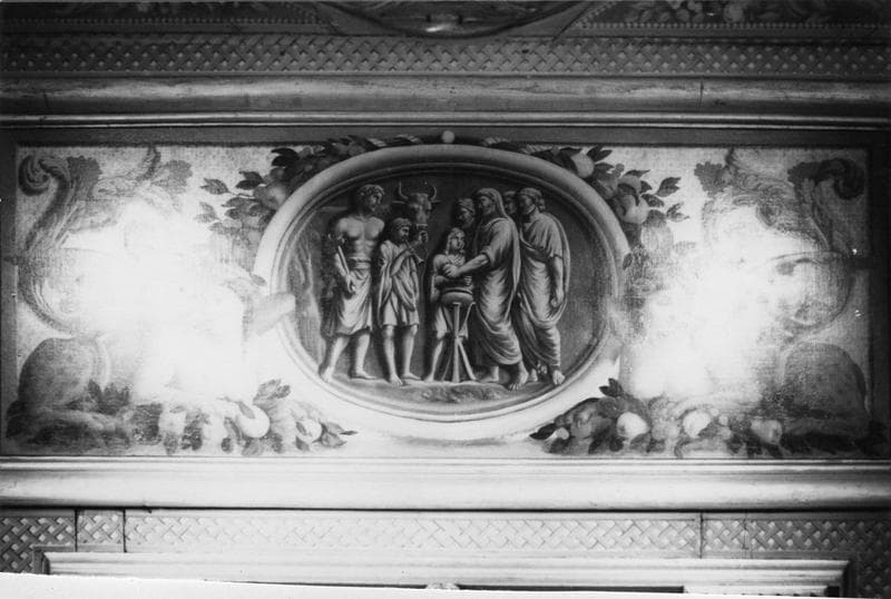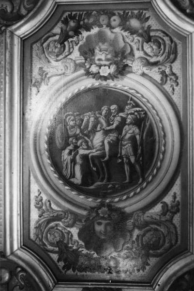 Décors du plafond : ensemble de grisailles décoratives, de scènes représentant : guerriers rentrant en triomphateurs, transport des urnes contenant les cendres de guerriers, sacrifice du boeuf, entretien du feu sacré ; motifs décoratifs en caisson ou en frise, armoiries de Léonor de Matignon, têtes de lions sculptées