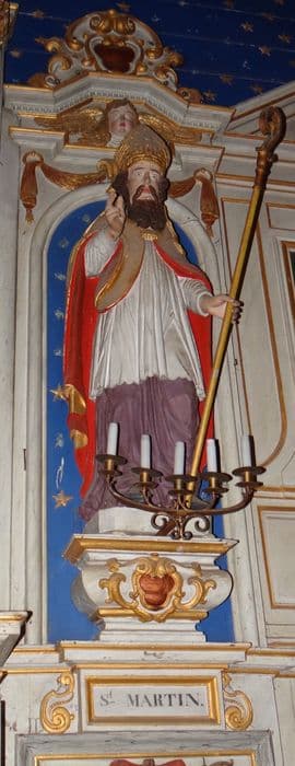 Deux colonnes torses baguées d'une couronne fleurdelisée, garnies de pampres et d'oiseaux picorant, soutiennent une corniche arrondie au-dessus d'un Chérubin ; en haut, deux départs de fronton à enroulements sur lesquels sont posés des anges encadrent un panneau figurant le Saint-Esprit et coiffé d'un fronton triangulaire ; côtés étroits