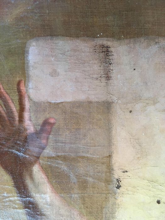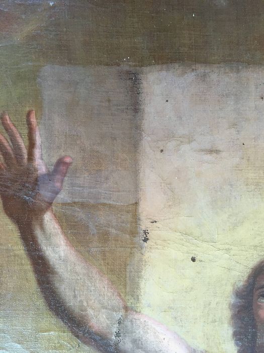 Déchirure dans le haut ; Petit trou au centre ; baguette clouée sur le pourtour de la surface peinte