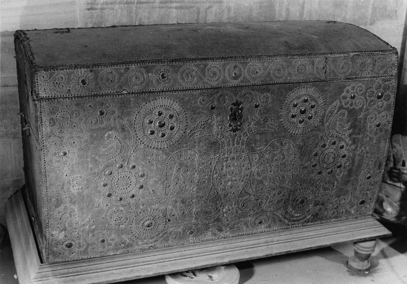Cette malle de voyage en cuir clouté du 18e siècle porte l'aigle à deux têtes du chapitre de Bayeux et les initiales EA.