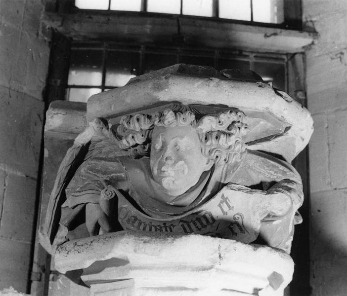 Ange accroupi sous la base d'une colonne à cinq pans incurvés, le bout des ailes touche presque les pieds. Il est recouvert d'une cape et déroule un phylactère.