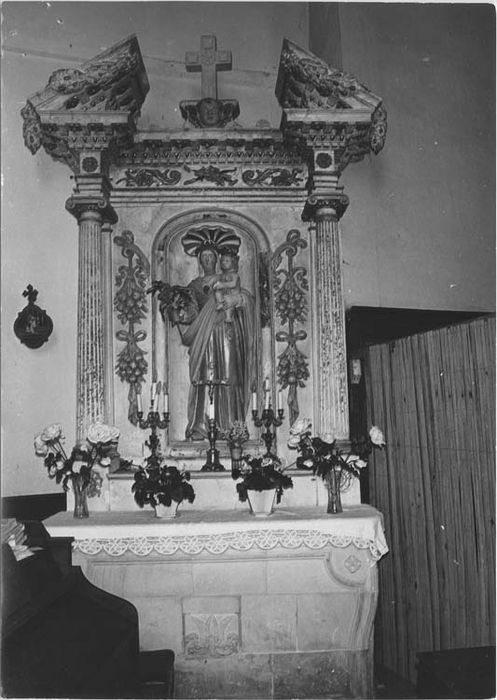 Autel tombeau légèrement galbé, au nord. Retable à deux colonnes ioniques cannelées, deux pilastres identiques, abritant une statue de la Vierge à l'Enfant dans une niche, encadrée de chutes de fruits, et fronton coupé avec festons de tores de laurier.