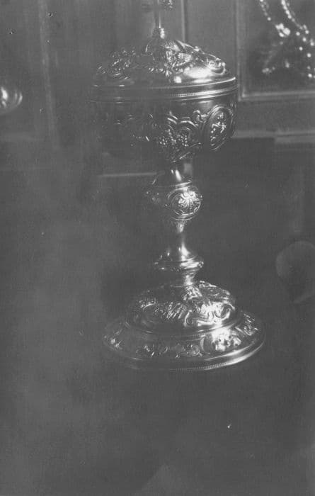 Ciboire sur pied circulaire. Cavet bordé de frises de perles. Décor de fleurs séparées par des réserves ornées de coquilles, de crochets et de feuilles d'acanthe. Terrasse ornée de cartouches ovales abritant des scènes religieuses. Tige balustre. Virole basse ornée de chapelets. Noeud allongé, renflé en partie haute, et orné de coquilles dans des lobes. Fausse coupe ajourée. Coupe sans décor. Couvercle bombé et galbé. Frise de perles et de petites torsades. Décor d'angelots sur les nuées, séparé par des pampres, des roseaux et des épis de blé. Croix sommitale fleuronnée.