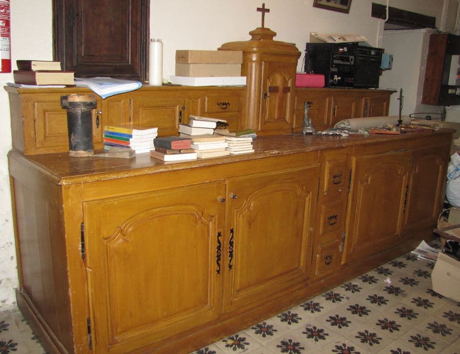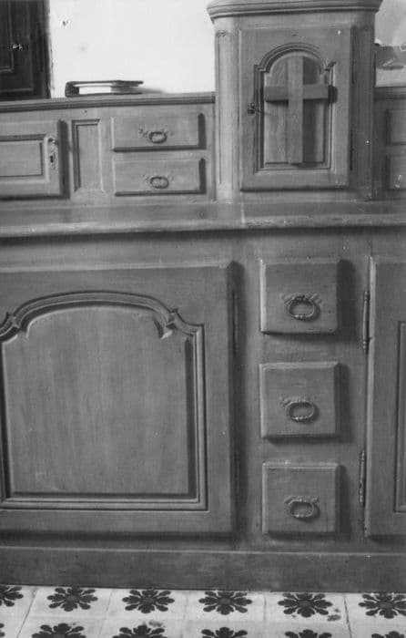 Chasublier en chêne peint faux bois clair, et sapin. Corps inférieur : deux chasubliers répartis symétriquement autour de trois tiroirs centraux superposés. Chaque chasublier ouvre par deux vantaux à panneau mouluré et traverse chantournée. Tiroirs carrés, moulurés. Corps supérieur : placé contre le mur, tabernacle de sacristie, au centre de tiroirs et placards symétriquement disposés. Tabernacle quadrangulaire, ouvrant sur le devant par une porte cintrée, moulurée. Angles arrondis avec panneau mouluré. De part et d'autre, deux tiroirs rectangulaires superposés, puis deux petits placards ouvrant chacun par un vantail à panneau mouluré.