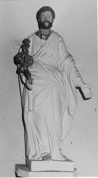 Plâtre blanc et polychrome / Stuc ? Choeur, mur est, côté nord. Main gauche : livre fermé. Main droite : clés. Toge ample. Socle : bulbe allongé godronné, frise de lambrequins dentelés.