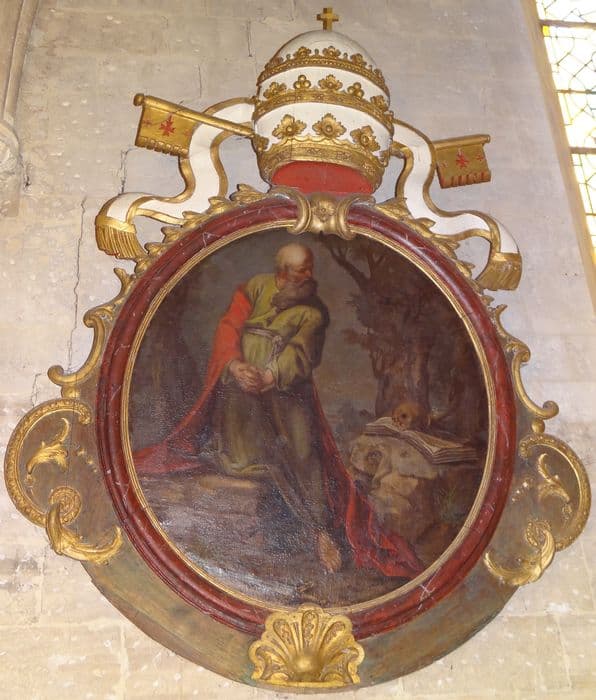 Tableau en médaillon. Cadre imposant en bois peint et doré. Faux marbre rouge veiné blanc sur la moulure centrale. Palmette, entrelacs, rinceaux et tore dorés sur le pourtour. Au sommet, tiare et clefs symboliques.