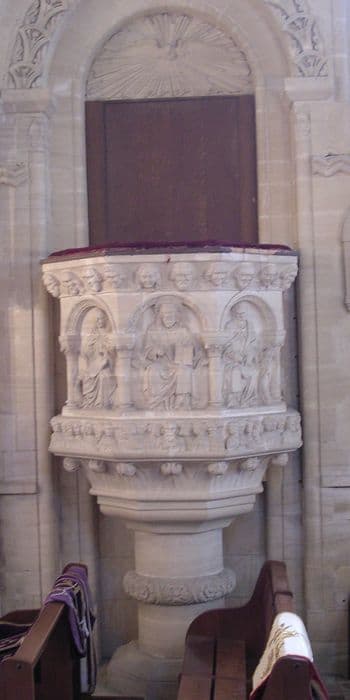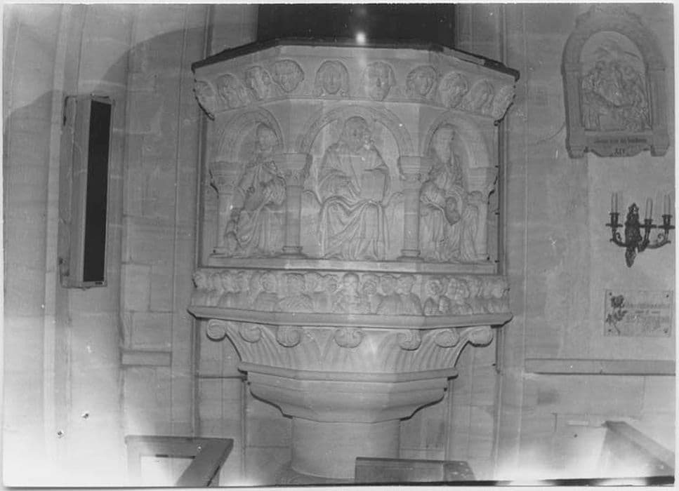 La chaire est inscrite dans l'architecture de l'église par son dorsal, dont la partie sommitale ne fait qu'un avec le tympan de l'arc en plein cintre sous lequel elle est placée. Base octogonale. Fût cylindrique, coupé en son centre par une collerette ornée de rosaces dans des entrelacs. Cuve hexagonale, soutenue par une frise de larges feuilles d'eau terminées en volutes. Frise inférieure sculptée de personnages en buste, représentant le peuple des fidèles. Espace médian divisé par cinq arcades en plein cintre dont l'intrados est orné d'une frise géométrique. Les arcs reposent sur des colonnes en haut relief, à chapiteau composite. Entre ces colonnes, cinq personnages sculptés en haut-relief. L'ensemble est surmonté d'une frise de personnages en tête. Main courante de la cuve rembourrée et recouverte de velours. Dorsal en bois, à un panneau. Le dorsal se termine par un tympan sculpté dans la pierre.