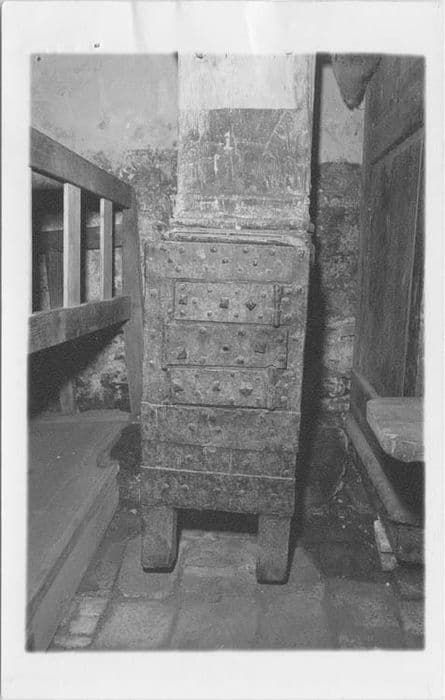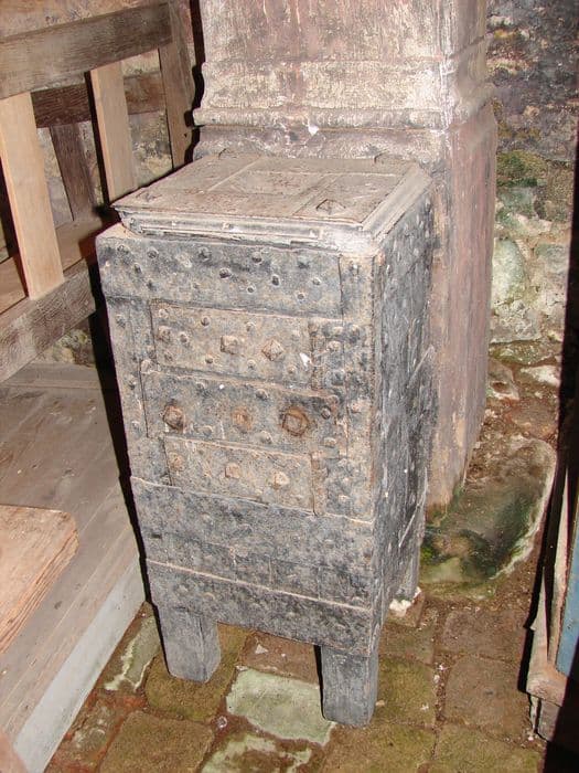 Tronc de quête. Tronc vertical à plan carré, sur quatre pieds. Faces recouvertes de plaques de fer cloutées.