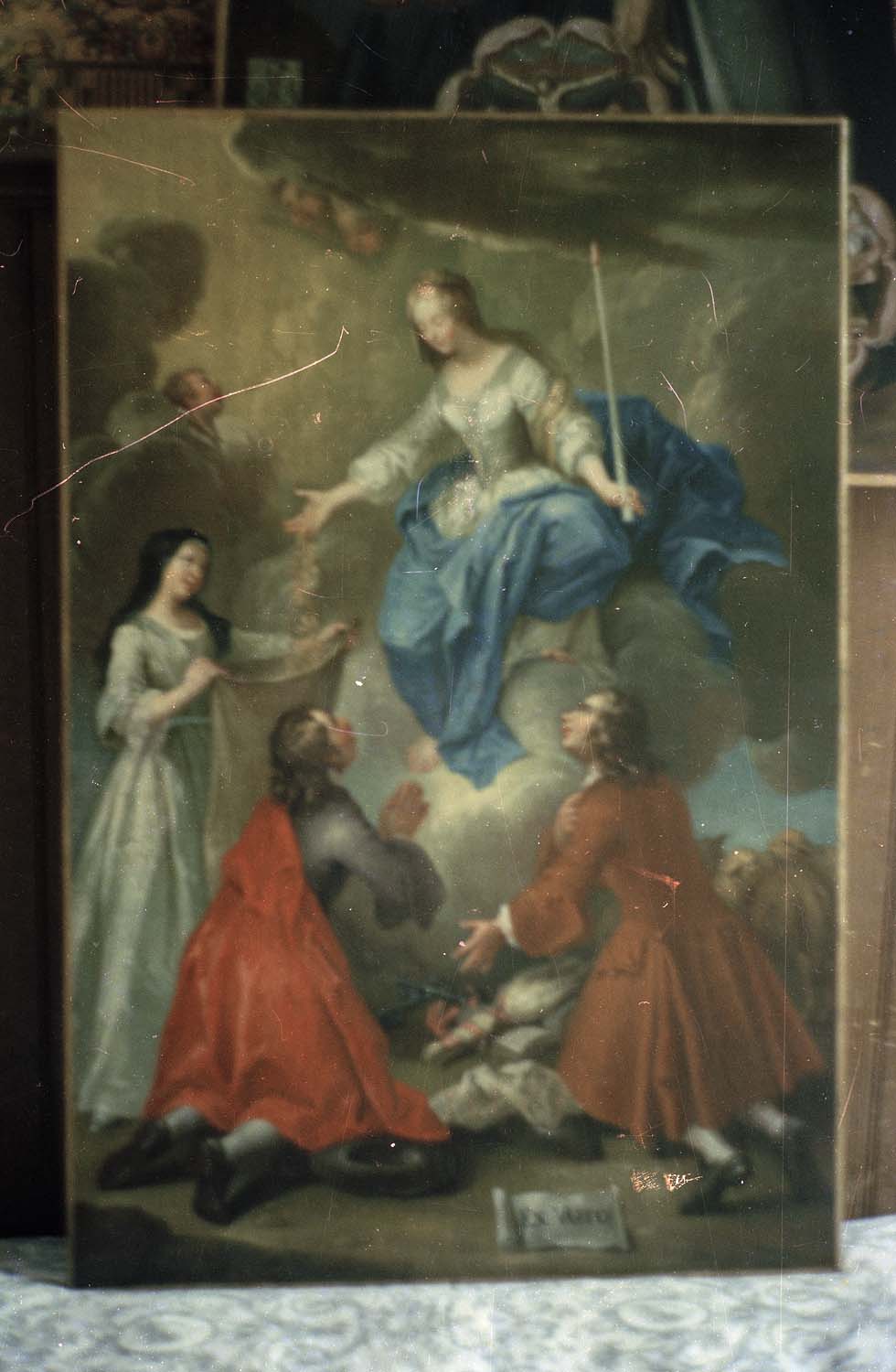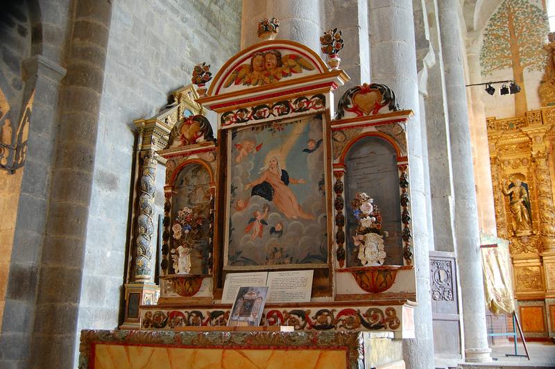 Il s'agit d'un ex-voto dont le sujet n'est pas complètement précisé. Extrait de Abel de Beaufrère :' La Vierge, parée d'une grâce toute humaine, est représentée sur les nuées, en costume de cour du XVIIIe siècle : robe blanche décolletée à demi-manches, taille fine, larges jupes froufroutantes sur lesquelles se drape un voile d'un bleu tendre. De la main gauche, elle porte un cierge allumé : celui qu'on fit brûler devant son image pour appeler son aide. De son poing droit s'échappent à la volée des grains de blé qu'une jeune femme, debout à ses pieds, reçoit dans un sac grand ouvert. Deux gentils-hommes à genoux rendent grâce'. De part et d'autre de la toile, deux niches abritent les statues des saints Timothée et Blaise. Ces deux statues proviennent du même atelier car elles sont traitées de façons semblable : une ligne serpentine part du haut de la mitre passe par les plis du vêtement et finit dans le pied droit. Les crosses inclinées achèvent de donner l'impression du mouvement suggerée par le genou avancé.