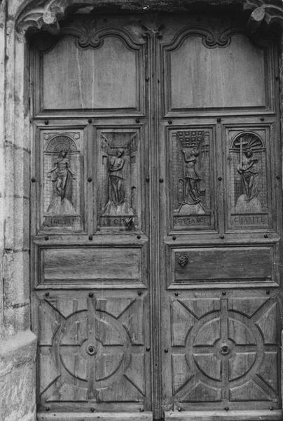 La tradition voulait que ces bas-reliefs aient été réutilisés dans la réalisation d'une nouvelle porte au 18e siècle. Si la comparaison stylistique avec les stalles conservées dans l'église est envisageable, l'observation plus approfondie lors de la restauration de 2013 a permis de démentir cette option. En effet, les dimensions de chaque panneau semble trop ajustées pour être seulement le fruit d'une bonne adaptation.