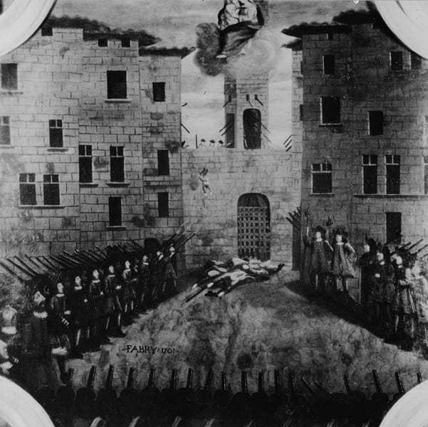 La porte d'Aurinques est attaquée par les protestants. Une trompette sonne déjà 'ville gagnée'. Mais la Vierge apparaît dans une lueur mystérieuse qui éclaire toute la ville. Les defenseurs arrivent à temps pour repousser l'adversaire. Le trompette est abattu. Il tombe de la muraille avec son instrument. La ville est sauvée.