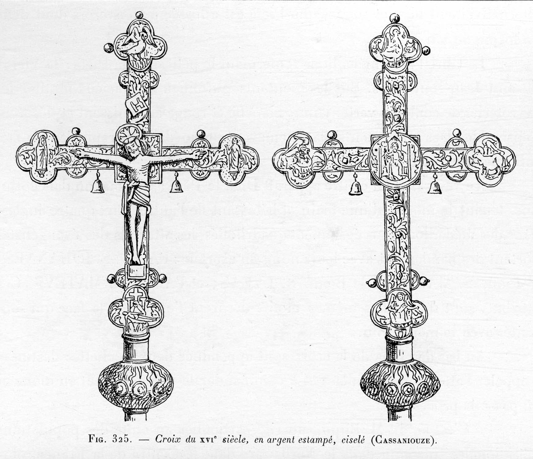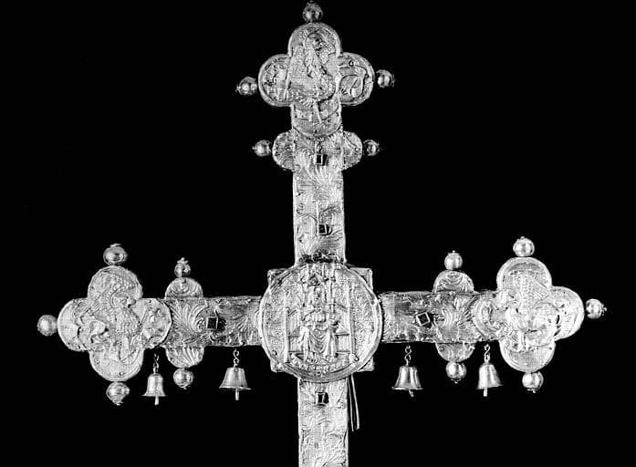 Croix faite de lames d'argent estampé ciselé émaillé et doré par parties, clouées sur une âme de bois. Deux clochettes pendent aux bras transversaux.