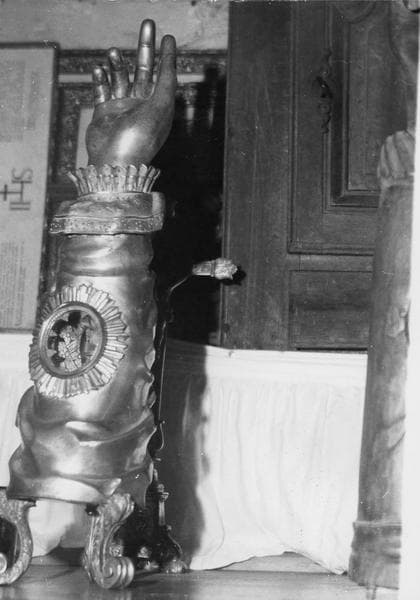 Bras reliquaire, main droite bénissante, trois premiers doigts ouverts, les deux autres légèrement repliés, émerge d'une manche légèrement bouillonnée au poignet orné de dentelles. A mi-hauteur, fenêtre ovale entourée de rayons. Au dos, poignet pour ostension.