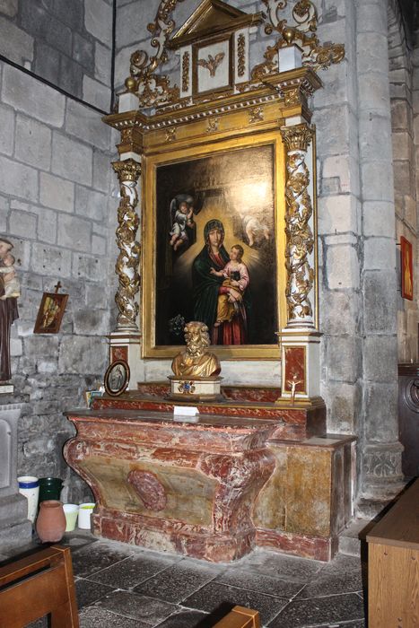 Grand retable constitué de deux colonnes torses en saillie et à chapiteaux corinthiens, encadrant une toile représentant la Vierge à l'Enfant entre deux anges et supportant un grand entablement à frise décorée de cinq motifs sculptés et à corniche denticulée, sur le quel se trouvent latéralement deux sphères sur des piédestaux et au centre un panneau carré surmonté d'un fronton triangulaire, dans le quel est inscrit un Saint-Esprit sous forme de colombe, le tout pris dans un ensemble de volutes. Emmarchement simple comportant un seul degrés entre les piédestaux des colonnes. Autel galbé en marbre rose.
