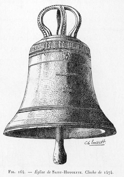 inscription : Fus arrtem tranrens per meduns illorum ibat l'an mil 4 cent soixante quatorze. Date : 1474. inscription : + MARIA XPS REX VENIT IN PACE DEUS HOMO FACTUS EST SANCTE HYPOLITE PER PRECES BEATE MARIAE VIRGINIS STI HYPOLITI STI JOANNIS BAPTISTA STI ROCHI et BEATA BARBARA ANTE SONITUM HUIUS TINTINABULI EFFUGIANT IGNITA JACULA INIMICI PECUTIO FULMINUM LAPIDUM et LESLO TEMPESTATUM PROSTERNAT AEREAS TEMPESTATES DEXTERA TUA VIRTUTIS UT HOC AUDIENTES TINTINABULI TREMESCUNT et FUGIANANT ANTE CRUCIS IN EO DEPICTUM VEXILLUM CUI FLECTLTZ OMNE GENU CAELES TIUM et INFERNORUM + 1660. Date : 1660.