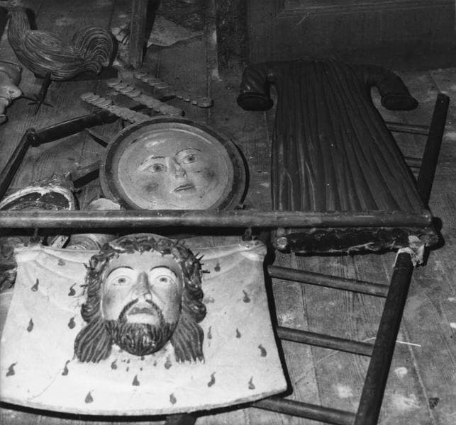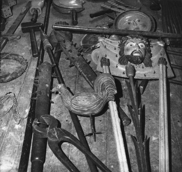 Bâtons de confrérie et emblèmes de pénitents : dix montés sur hampes, groupes de petits personnages, trente trois représentant les Instruments de la Passion. Vestige d'une Piéta, dont il ne reste qu'une partie du corps du Christ en trois morceaux.