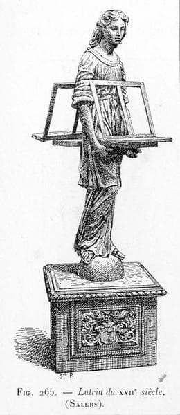 Formé par la statue d'un ange, en pied, dont les mains pendantes supportent le pupitre. Un second pupitre est fixé sur son dos.